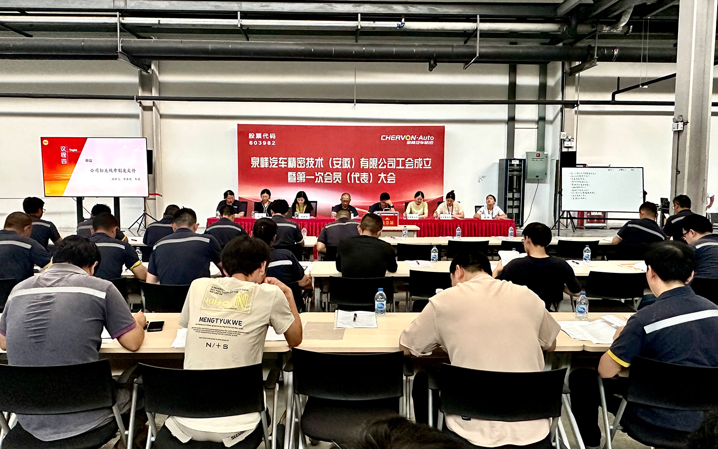 On the afternoon of August 11, 2023, the establishment of the trade union and the first member (representative) conference of Chervon Auto Precision Technology (Anhui) Co., Ltd. was successfully held in the machine workshop of the Maanshan plant, and 48 employee representatives and 17 non-voting representatives from various lines of the company attended the meeting.